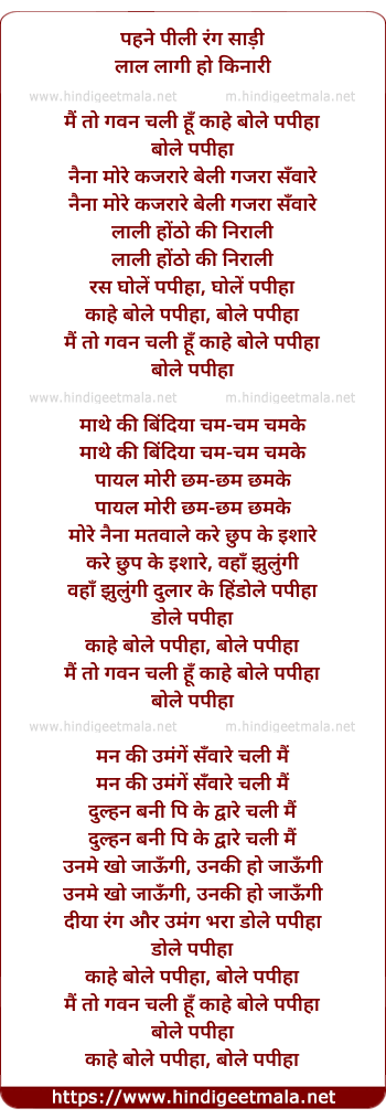 Lyrics of Pehne Peeli Rang Saari - पहने पीली रंग साड़ी