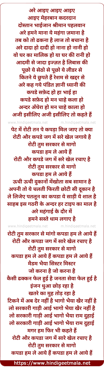 Comments on song "Pet Mein Roti, Tan Pe Kapda"