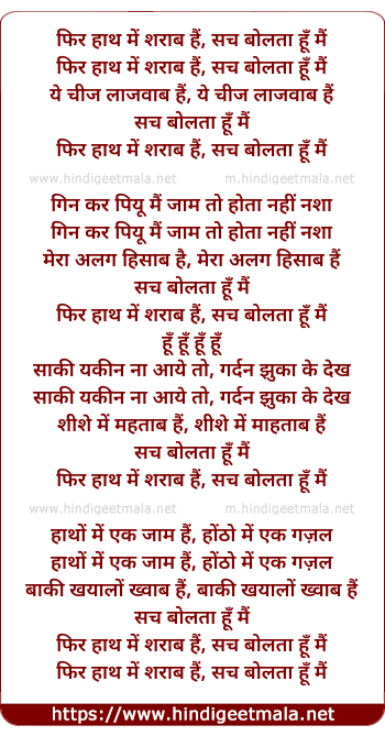 Lyrics of Phir Hath Me Sharab Hai, Sach Bolta Hu Mai - फिर हाथ में शराब हैं, सच बोलता हूँ मैं