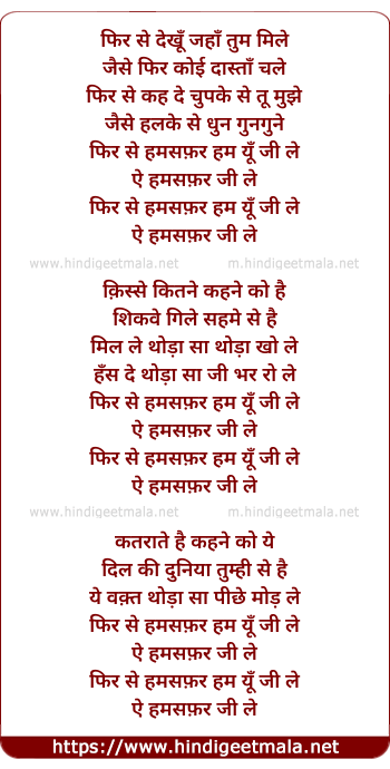 Lyrics of Phir Se - फिर से देखूँ जहाँ तुम मिले