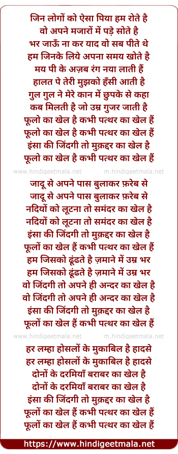 Lyrics of Phoolo Ka Khel Hai - जिन लोगों को ऐसा पिया हम रोते है