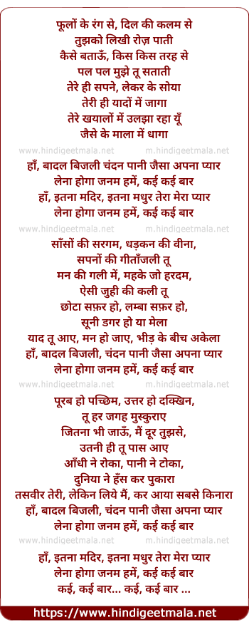 Lyrics of Phulo Ke Rang Se, Dil Ki Kalam Se, Tujhko Likhi Roz Paati - फूलों के रंग से दिल की कलम से, तुझको लिखी रोज़ पाती