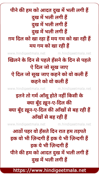 Lyrics of Pine Ki Ham Ko Aadat Dukh Men Bhali Lagi Hai - पीने की हम को आदत दुख में भली लगी हैं