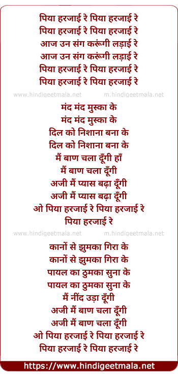 Lyrics of Piya Harjayi Re - पिया हरजाई रे