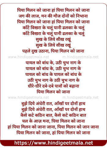 Lyrics of Piya Milan Ko Jana Ha Piya Milan Ko Jana - पिया मिलन को जाना हां पिया मिलन को जाना
