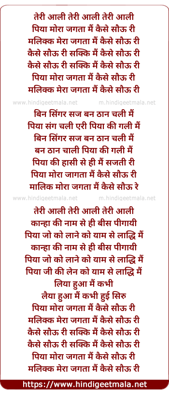 Lyrics of Piya Mora Jaagta, Main Kaise Sou Ri - तेरी आली तेरी आली तेरी आली