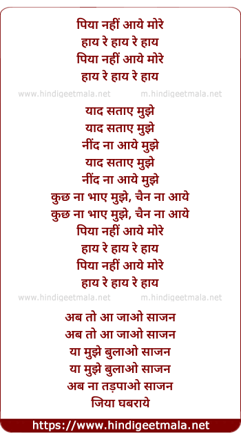Lyrics of Piya Nahi Aaye Mohe - पिया नहीं आये मोरे