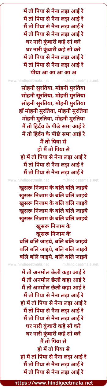 Lyrics of Piya Se Naina - मैं तो पिया से नैना लड़ा आई रे