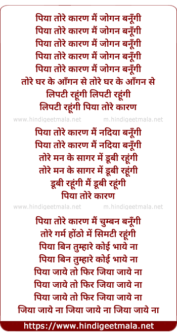 Lyrics of Piya Tore Karan Mai Jogan Banungi - पिया तोरे कारण मैं जोगन बनूँगी