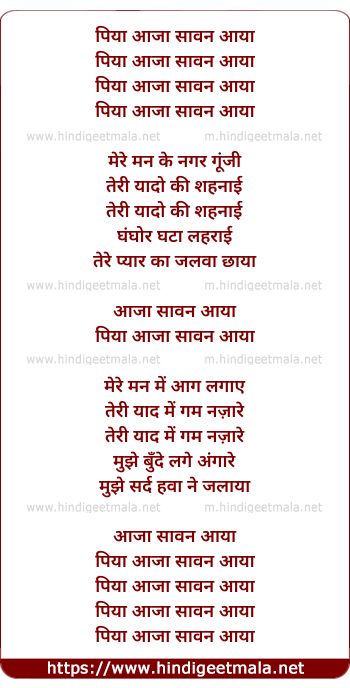 Lyrics of Piyaa Aajaa Saavan Aayaa - पिया आजा सावन आया