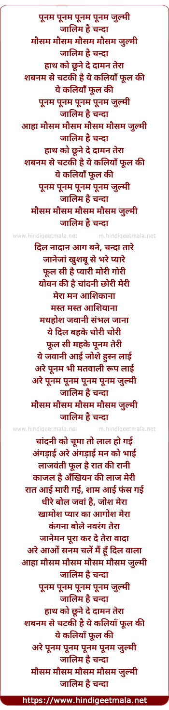 Lyrics of Poonam Julmi Jaalim Hai Chand - पूनम जुल्मी जुल्मी है चाँद