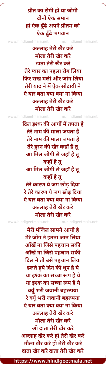 Lyrics of Preet Ka Rogi Ho Ya Jogi (Allah Teri Khair Kare) - प्रीत का रोगी हो या जोगी (अल्लाह तेरी खैर करे )