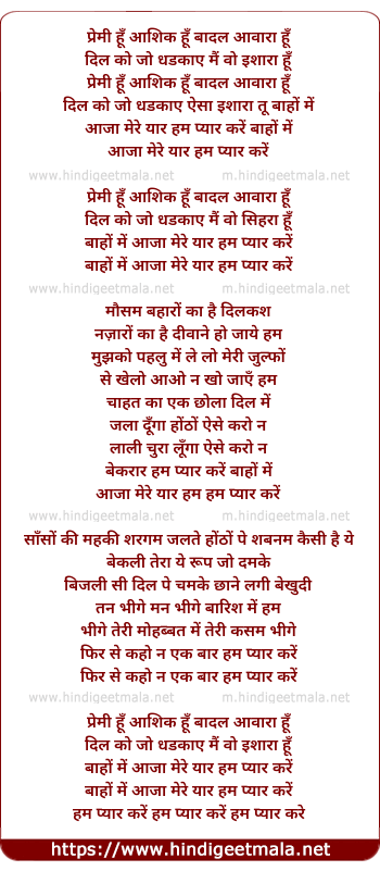 Lyrics of Premi Hu Aashiq Ho Badal Aawara Hu - प्रेमी हूँ आशिक हूँ बादल आवारा हूँ