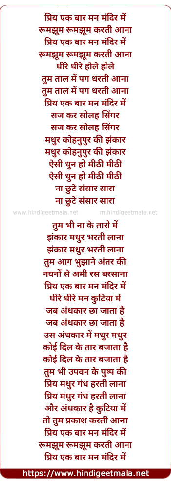 Lyrics of Priya Ek Baar Mann Mandir Me - प्रिय एक बार मन मंदिर में
