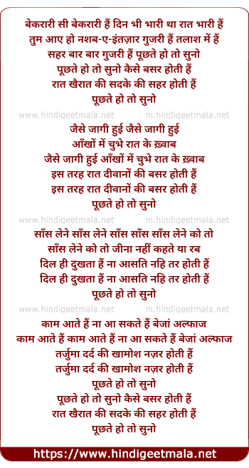 Lyrics of Puchhte Ho To Suno - बेकरारी सी बेकरारी हैं दिन भी भारी था रात भारी हैं