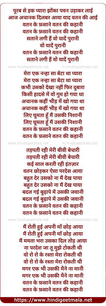 Lyrics of Purab Se Ik Pyara Jhonka, Vatan Ke Fasane - पूरब से इक प्यारा झोंका, वतन के फ़साने