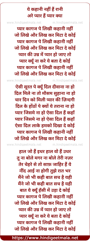 Poetic Translation - Lyrics of Pyaar Kaagaj Pe Likhi Kahaani Nahi (Male) - ये कहानी नहीं हैं रानी