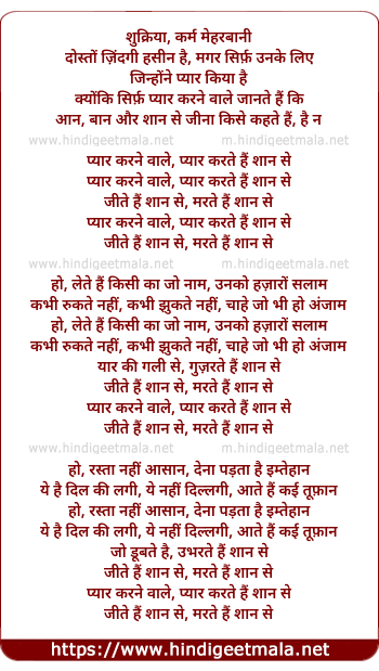Lyrics of Pyar Karane Vaale, Pyar Karate ,Hain Shan Se - प्यार करने वाले, प्यार करते ,हैं शान से