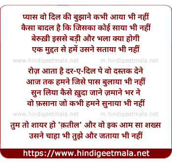 Lyrics of Pyaas Wo Dil Ki Bujhaane Kabhi Aayaa Bhi Nahin - प्यास वो दिल की बुझाने कभी आया भी नहीं