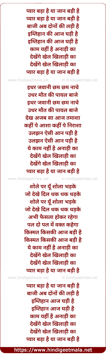 Lyrics of Pyar Bada Hai Ya Jaan Badi Hai - प्यार बड़ा है या जान बड़ी है