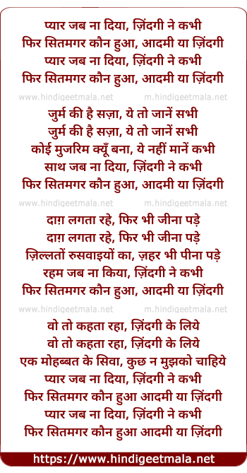 Lyrics of Pyar Jab Na Diya Zindagi Ne Kabhi Phir Stimgar - प्यार जब ना दिया ज़िंदगी ने कभी फिर सितमगर