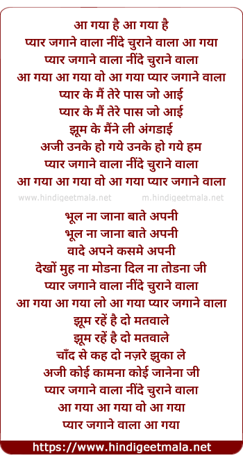 Lyrics of Pyar Jagane Wala Neend Churane Wala - प्यार जगाने वाला नींद चुराने वाला
