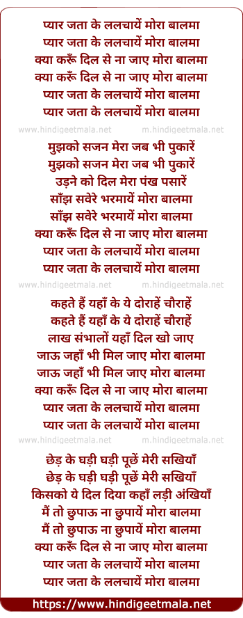 Lyrics of Pyar Jata Ke Lalchaye Mora Balam - प्यार जता के ललचायें मोरा बालमा
