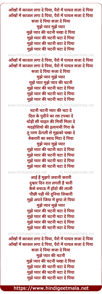 Lyrics of Pyar Ki Chatini (Remix) - आँखों में काजल लगा दे पिया, पैरो में पायल सजा दे पिया