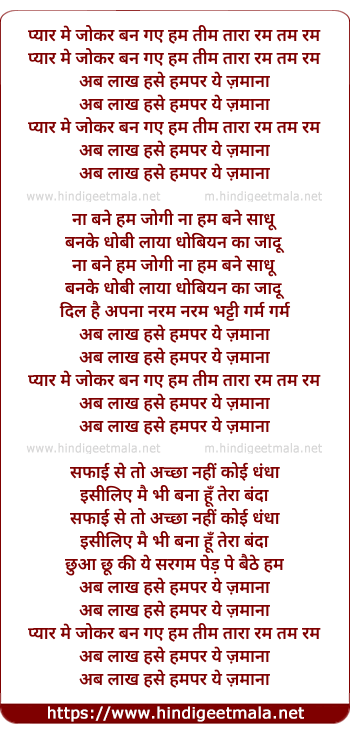 Lyrics of Pyar Me Joker Ban Gaye Hum - प्यार मे जोकर बन गये हम
