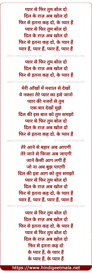 Lyrics of Pyar Se Phir - प्यार से फिर तुम बोल दो