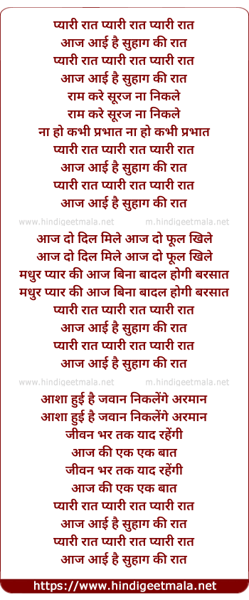 Lyrics of Pyari Raat, Pyari Raat, Aaj Aayi Hai Suhag Ki Raat - प्यारी रात प्यारी रात आज आई है सुहाग की रात