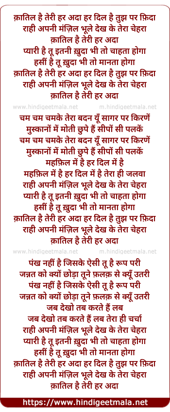 Lyrics of Qaatil Hai Teri Har Adaa Har Dil Hai Tujh Par Fidaa - क़ातिल है तेरी हर अदा हर दिल है तुझ पर फ़िदा