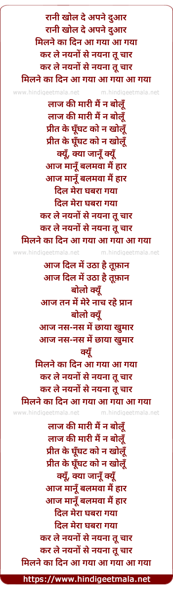 Lyrics of Raani Khol De Apane Duaar Milane Kaa Din Aa Gayaa - रानी खोल दे अपने दुआर