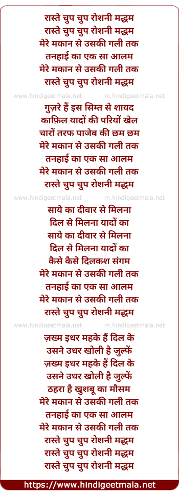 Lyrics of Raaste Chup Chup - रास्ते चुप चुप रोशनी मद्धम