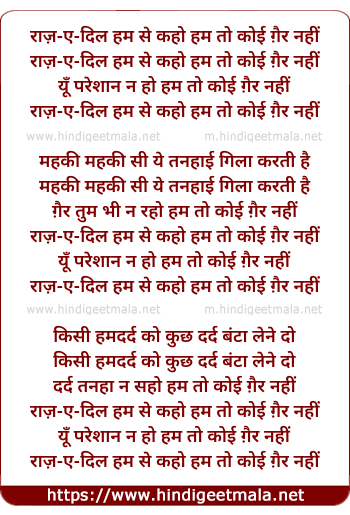 Lyrics of Raaz E Dil Ham Se Kaho Ham To Koi Gair Nahin - राज़ ए दिल हम से कहो हम तो कोई ग़ैर नहीं