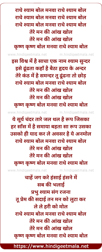 Lyrics of Radhe Shyam Gaaye Ja - राधे श्याम बोल मनवा राधे श्याम बोल