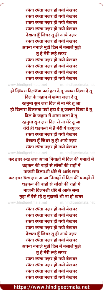 Lyrics of Rafta Rafta Najar Ho Gayee Bekhabar - रफ्ता रफ्ता नज़र हो गयी बेखबर