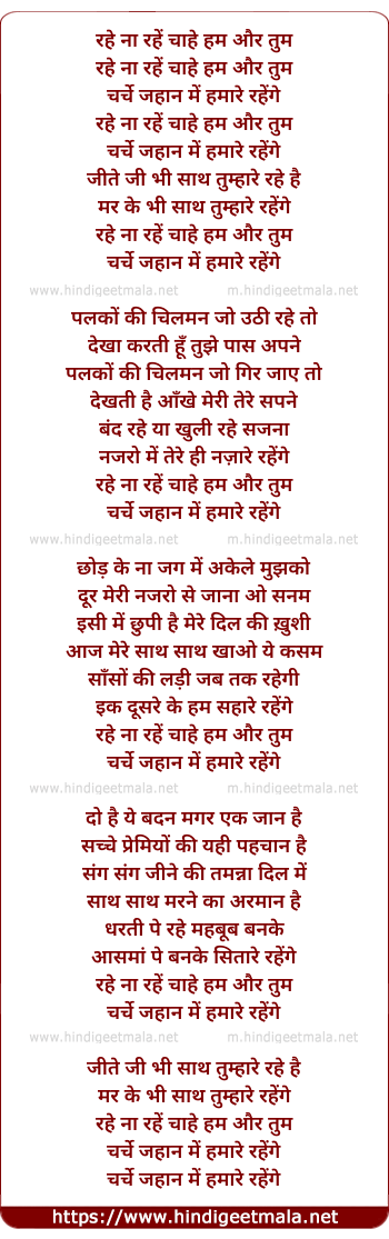 Lyrics of Rahe Naa Rahe Chahe Hum Aur Tum - रहे ना रहें चाहे हम और तुम