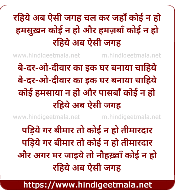 Lyrics of Rahiye Ab Aisi Jagah Chal Kar Jahaan - रहिये अब ऐसी जगह चल कर जहाँ