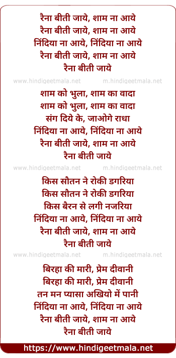 Lyrics of Rainaa Biti Jaaye Shyaam Naa Aaye - रैना बीती जाये, शाम ना आये