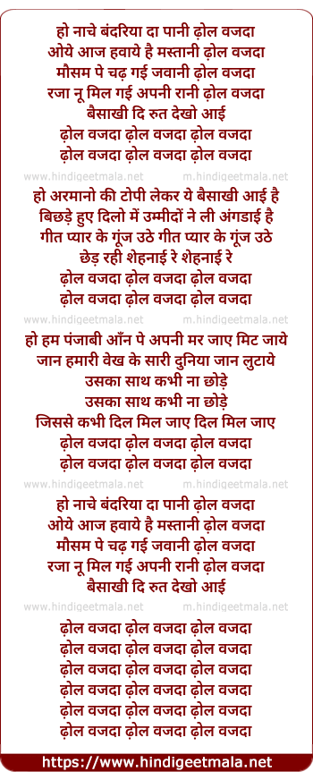 Lyrics of Raja Nu Mil Gayi Apni Rani, Dhol Wajda - हो नाचे बंदरिया दा पानी ढ़ोल वजदा