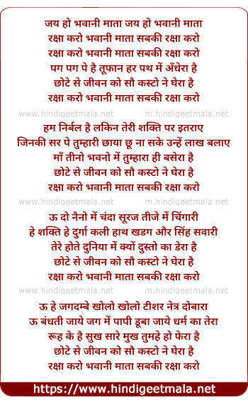 Lyrics of Raksha Karo Bhawani Mata - रक्षा करो भवानी माता