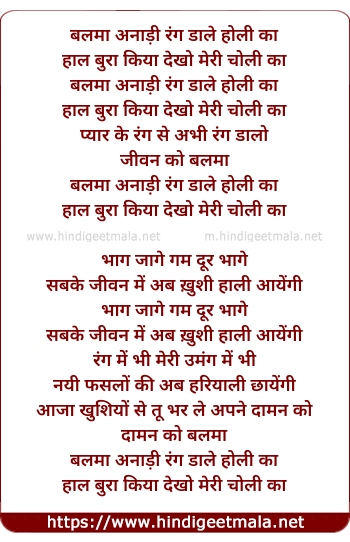 Lyrics of Balma Anadi Rang Dale Holi Ka - बलमा अनाड़ी रंग डाले होली का