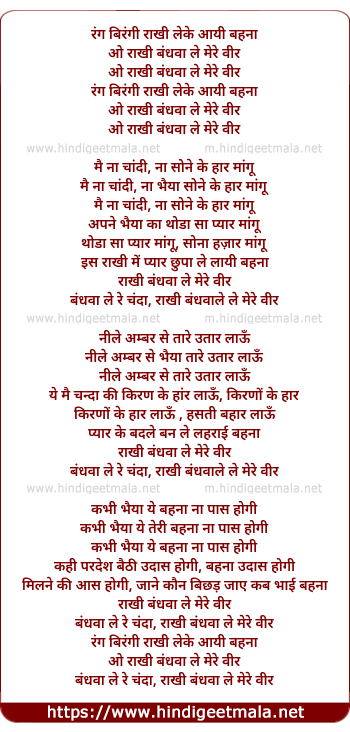 Lyrics of Rang Birangi Rakhi Leke Aayi Bahana - रंग बिरंगी राखी लेके आयी बेहना