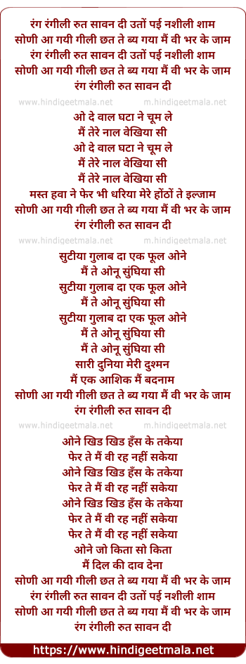 Lyrics of Rang Rangeeli Rut - रंग रंगीली रुत सावन दी उतों पई नशीली शाम