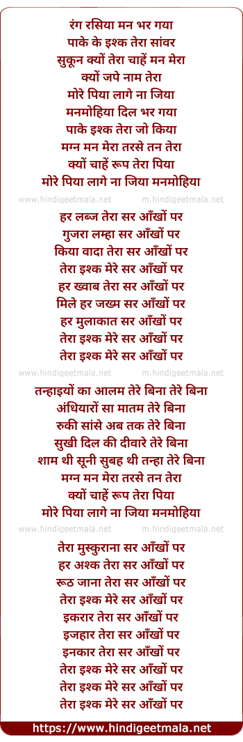 Lyrics of Rang Rasiya Man Bhar Gaya - रंग रसिया मन भर गया