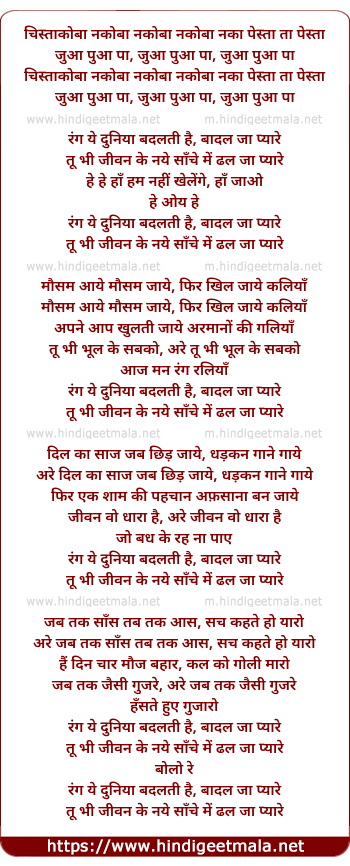 Lyrics of Rang Yeh Duneeya Badalatee Hai - रंग ये दुनिया बदलती है