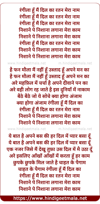 Lyrics of Rangila Hu Mai Dil Ka Ratan Mera Naam - रंगीला हूँ मैं दिल का रतन मेरा नाम