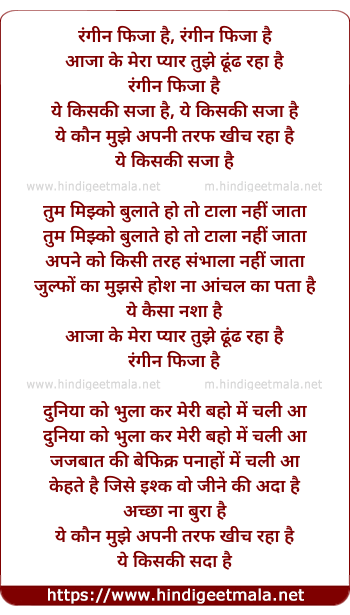 Lyrics of Rangin Fiza Hai Aaja - रंगीन फिजा है आजा