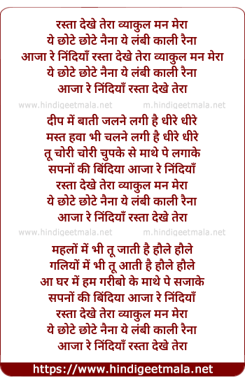 Lyrics of Rasta Dekhe Teraa Vyakul Mann Meraa - रस्ता देखे तेरा व्याकुल मन मेरा